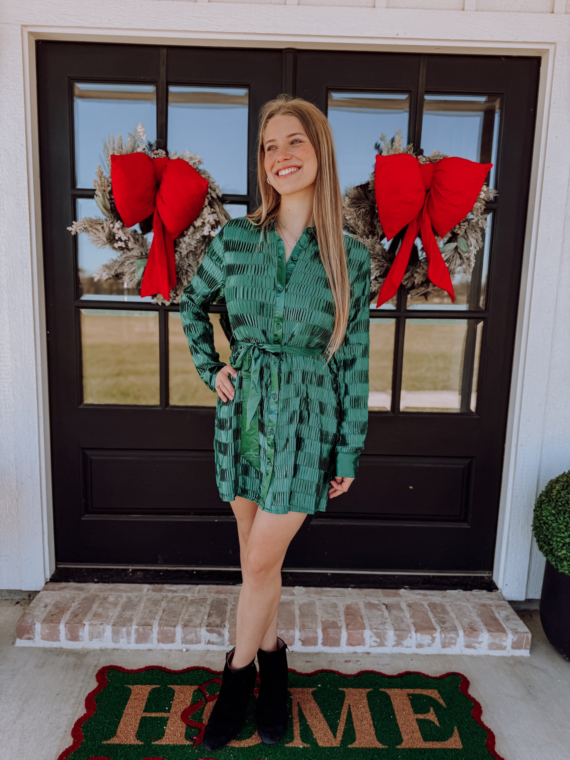 - Shiny Satin Pleated Holiday Party Shirt Mini Dress - Long Sleeve - Button Down - W/ Waist Tie - Round Hem - Bright Colors - Festive Dress - Date Night Out Dress - Christmas Dress